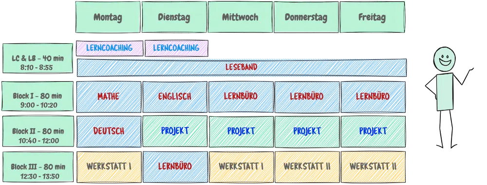 Der Tag beginnt an zwei Tagen mit dem Lerncoaching: In kleinen Gruppen setzen sich Lernpartner:innen mit ihren Zielen auseinander und planen gemeinsam die Woche – individuell begleitet durch ihre Lerncoachin oder ihren Lerncoach.